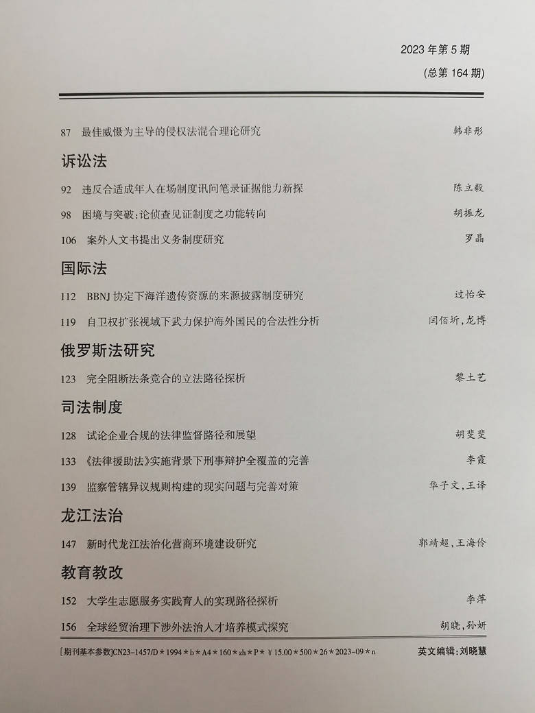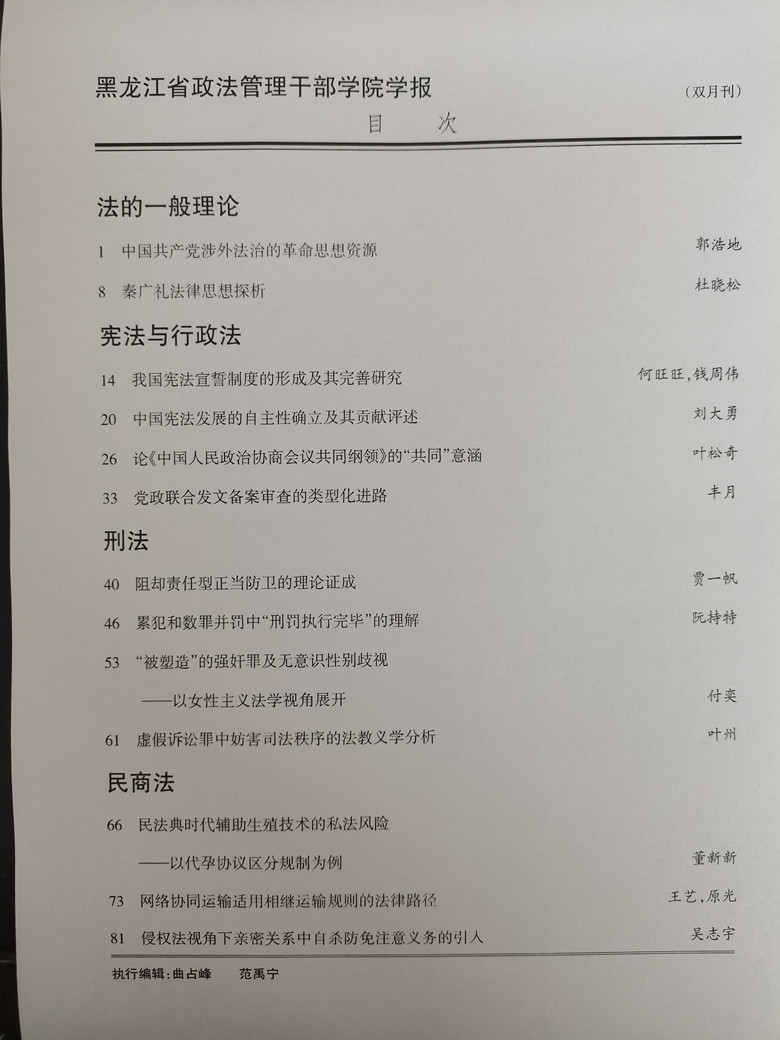 黑龙江省政法管理干部学院学报2023年第5期目录
